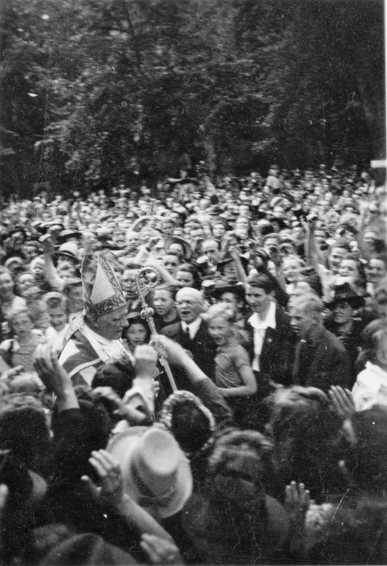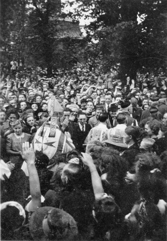 Clemens August von Galen inmitten einer unüberschaubaren Menschenmenge auf dem Kapellenplatz; Juni 1942.