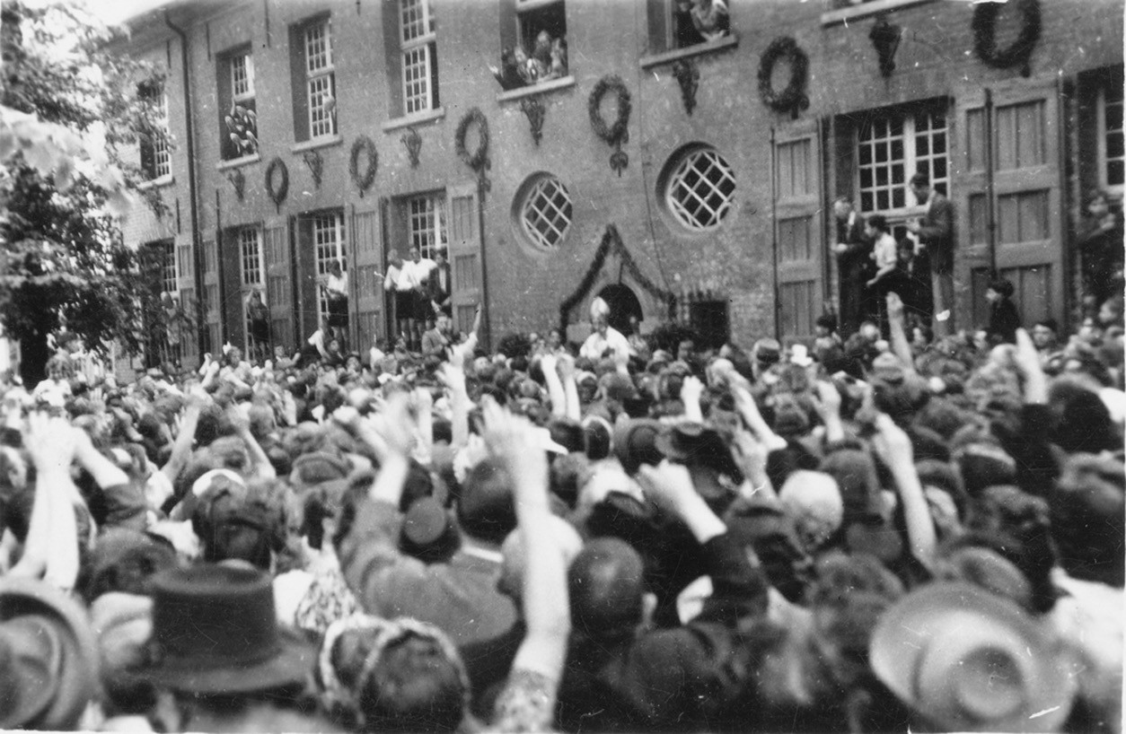 Clemens August von Galen am Eingang des Priesterhauses, vor einer begeisterten Menge stürmisch umjubelt; Juni 1942.