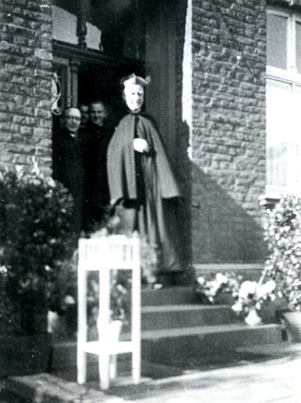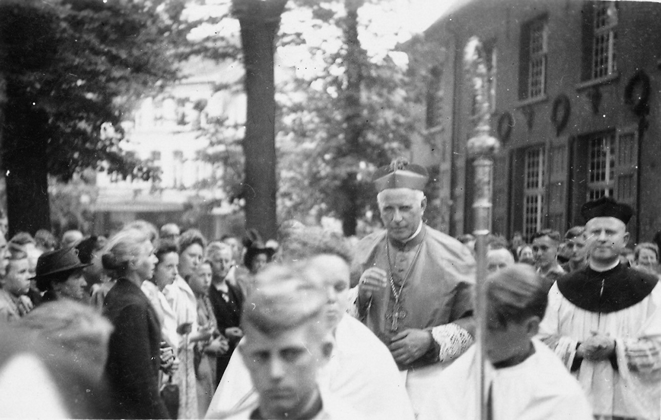 Clemens August von Galen am Eingang des Priesterhauses in Kevelaer; September 1942.
