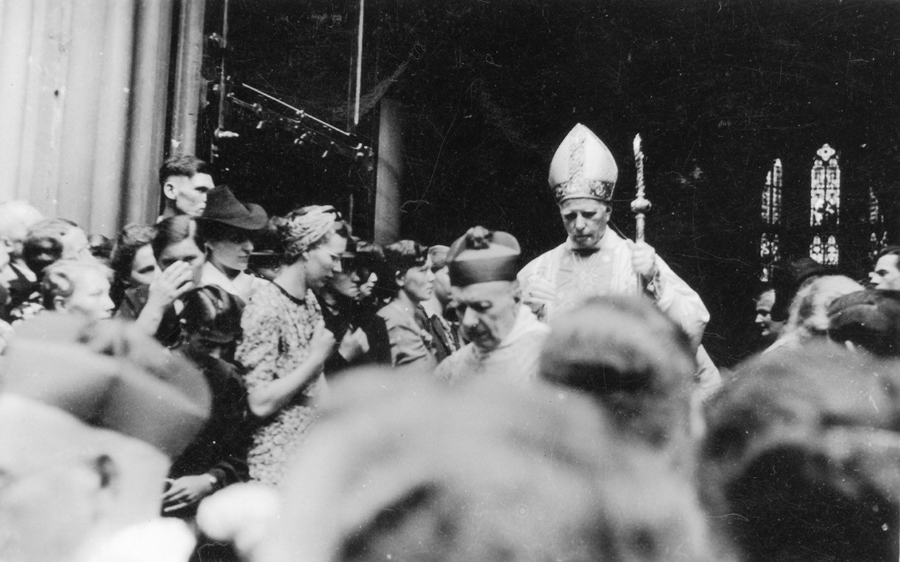 Clemens August von Galen beim Verlassen der Basilika durch das Turmportal; Juni 1942.