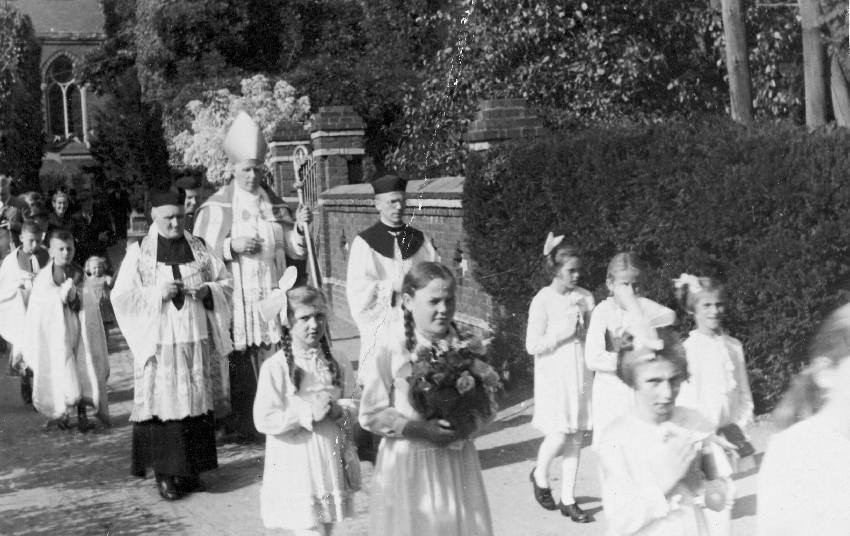 Der Bischof von Münster, Clemens August Graf von Galen vor dem Pfarrhaus in der Pastoratstraße anlässlich der Firmspendung am 12.09.1941 in Kervenheim (Ortschaft von Kevelaer). Links im Bild zu sehen ist der Pfarrer Franz Nellis.