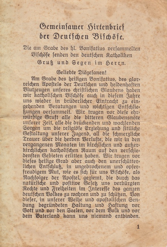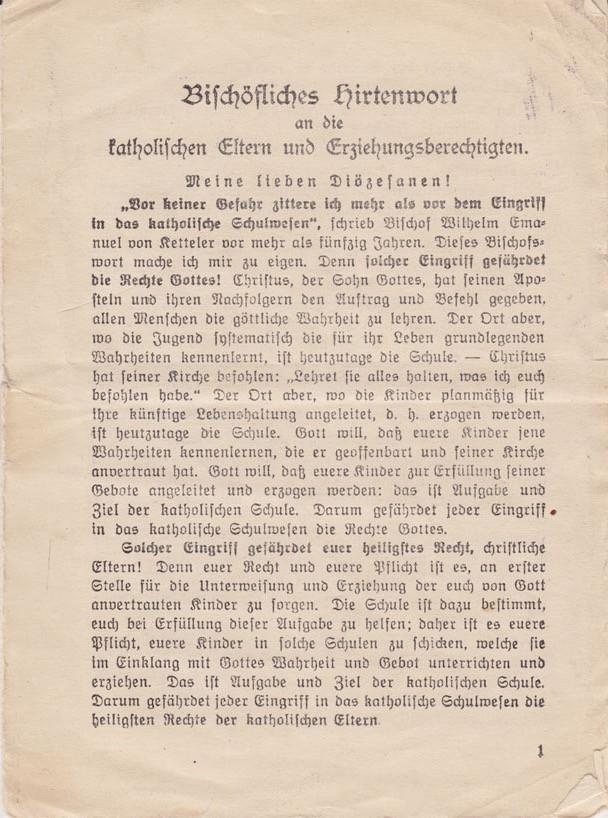 Bischöfliches Hirtenwort vom 25. Februar 1937 an die katholischen Eltern und Erziehungsberechtigten.
