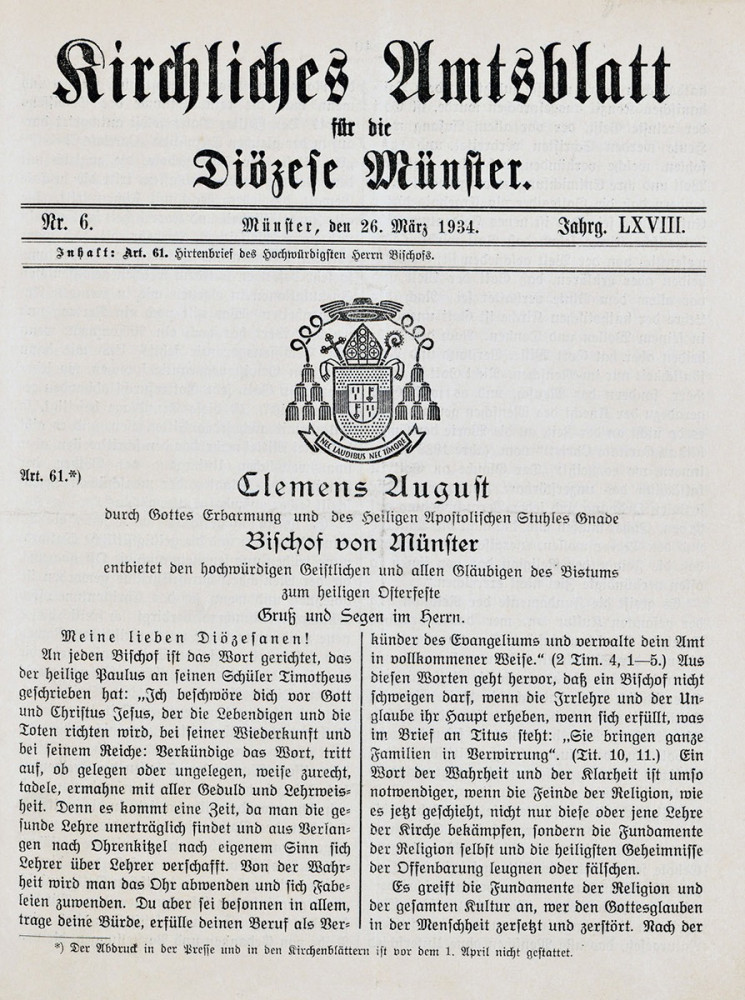 Am 26. März 1934 verfasste Clemens August von Galen einen Hirtenbrief gegen die nationalsozialistische Rassenlehre.