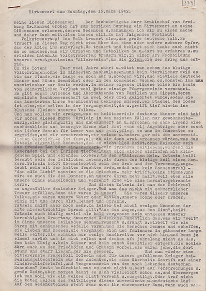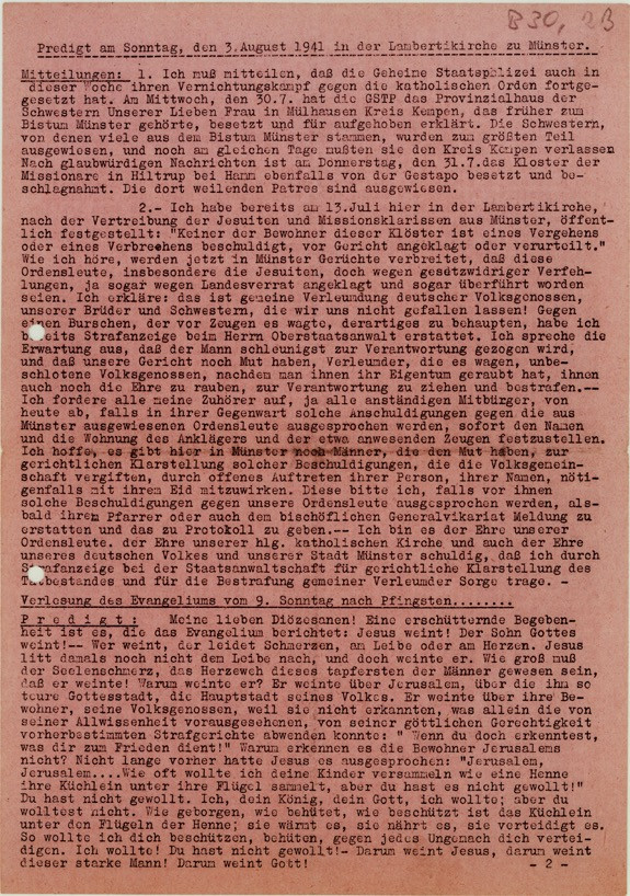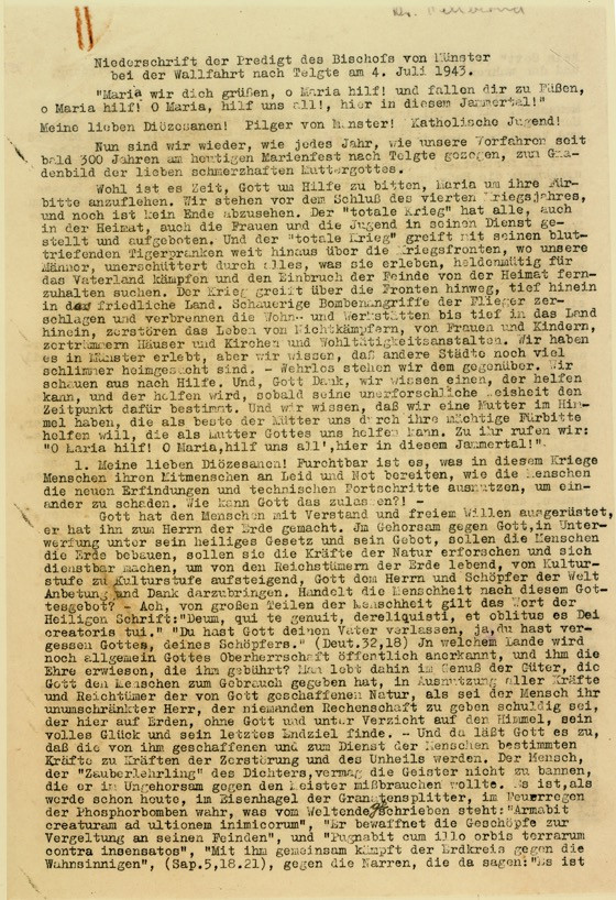 Niederschrift der Predigt des Bischofs von Münster bei der Wallfahrt nach Telgte am 4. Juli 1943.