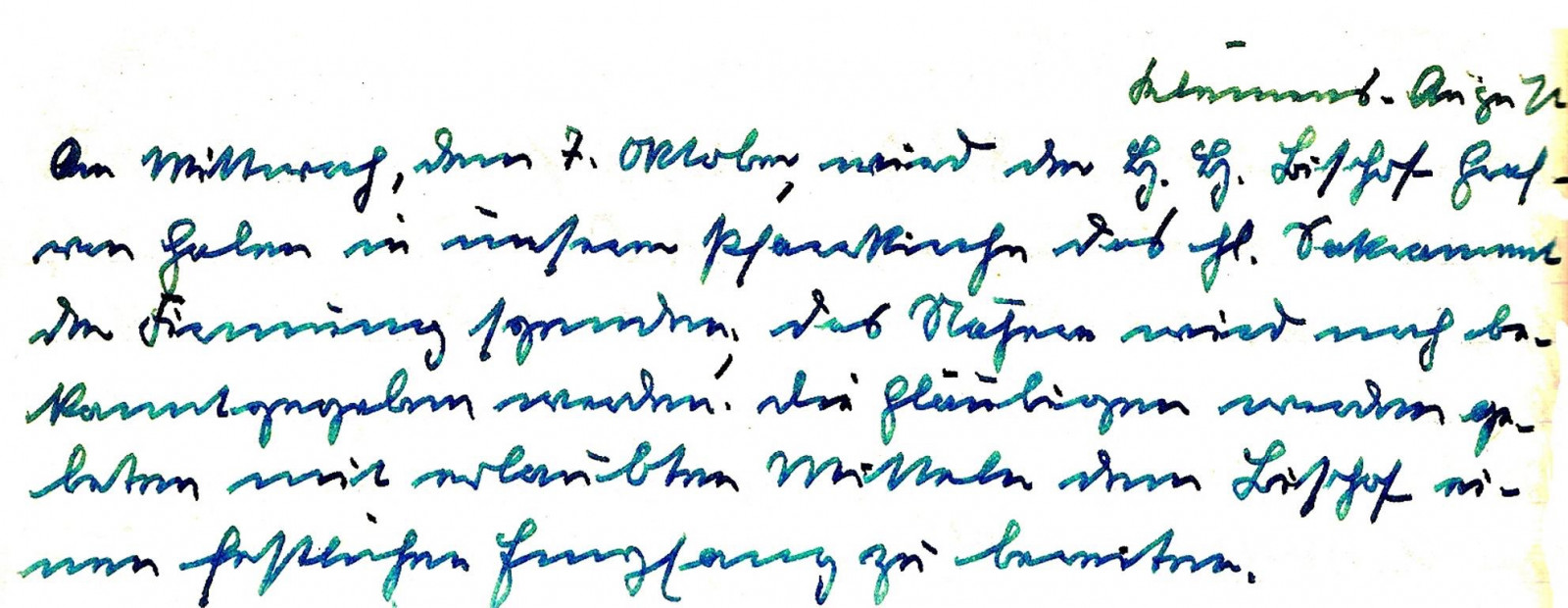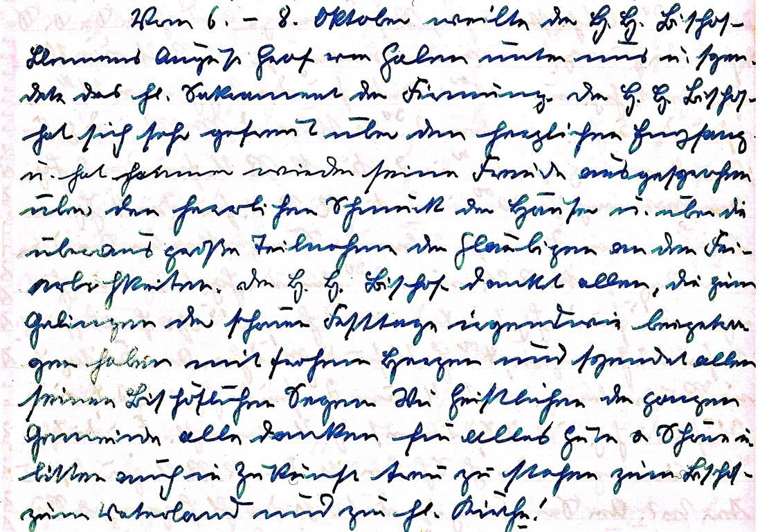 Aus dem Wortlaut geht hervor, dass Heinrich Müller ihm wohl für die bekanntgewordene Aufnahme ins Kardinalskollegium gratuliert hatte, obwohl diese formal erst im März erfolgte. Graf von Galen bezieht sich auf eine geplante Romreise im Juli.Übergeben von Claudia Salzburg, Enkeltochter von Heinrich Müller