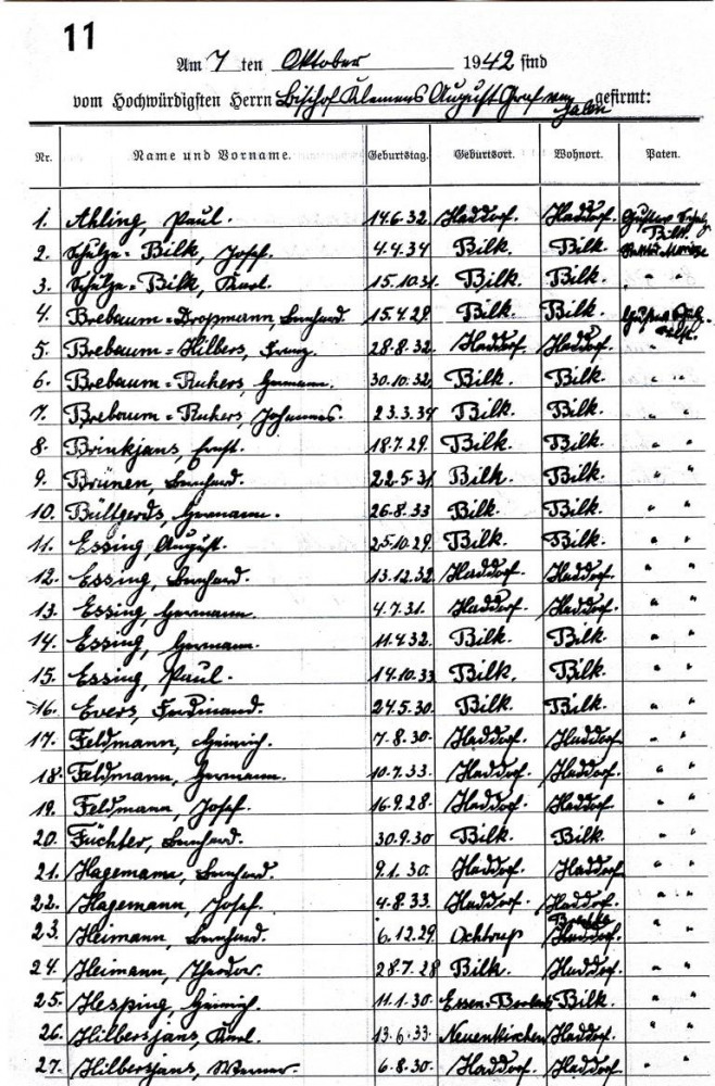Liste der Firmlinge am 7. Oktober 1942 in Bilk, St. Michael (Wettringen)