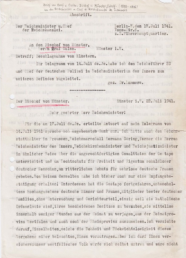 Bei dem Dokument handelt es sich um die Abschrift eines Briefes von Clemens August von Galen an Reichminister und Chef der Reichskanzlei Dr. Lammers vom 22. Juli 1941. Das Schriftstück stellte freundlicherweise Herr Axel Münster aus Pfedelbach (Region Heilbronn) zur Verfügung; er schreibt am 7. November 2016: „Ich kam durch den Nachlass meines Großonkels in den Besitz dieses Schreibens. Er war Rechtsanwalt in Stuttgart und aufgrund seiner jüdischen Abstammung selbst Repressalien durch das NS-Regime ausgesetzt. – Ich denke, dieses Dokument ist in Ihrem Galen-Archiv besser aufgehoben, als dass ich es weiter in meinen Familienunterlagen aufbewahre. Wenn ich Ihnen damit einen Gefallen erwiesen habe, würde es mich freuen.“