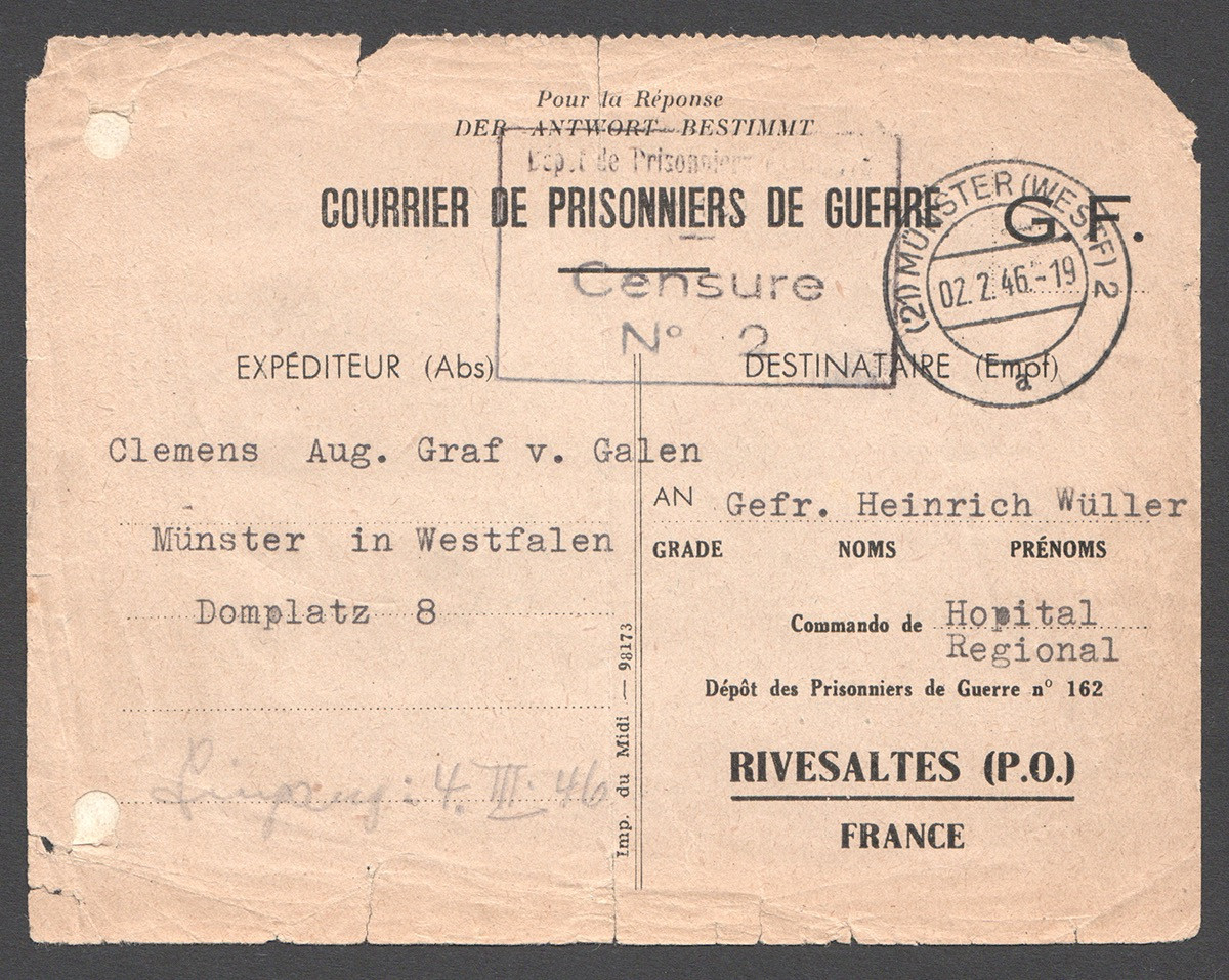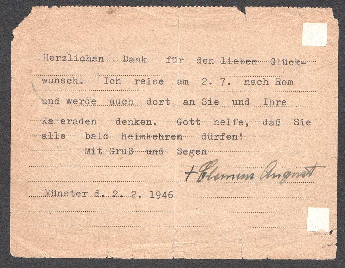 1/1 Grußkarte, die Kardinal von Galen am 2. Februar 1946 in die französische Kriegsgefangenschaft (Hospital Rivesaltes) an den Gefreiten Heinrich Müller geschrieben hat.