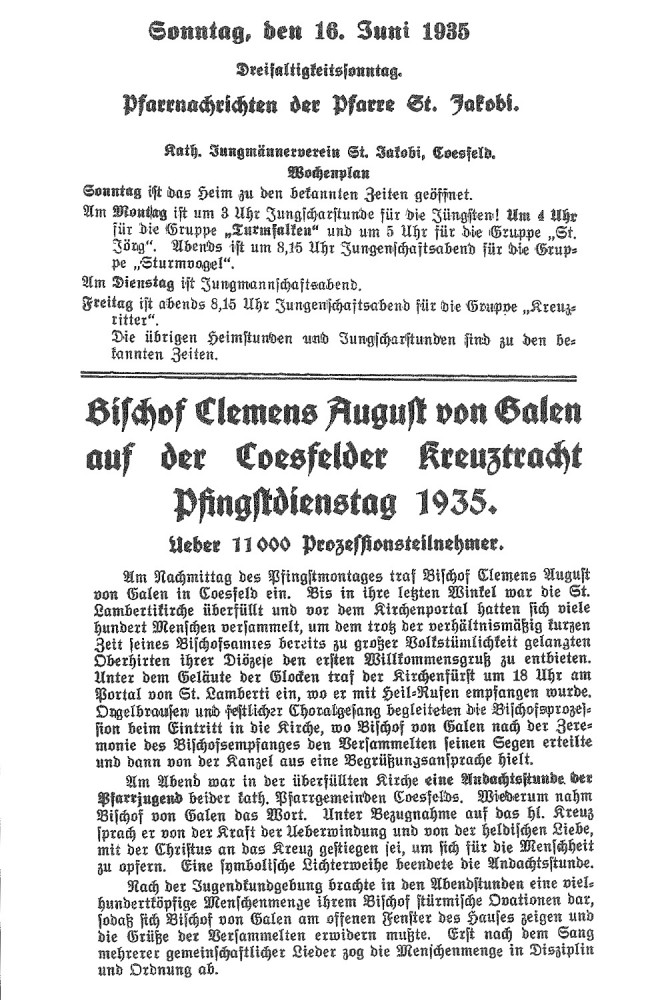 Pfarrnachrichten der Pfarre St. Jakobi vom 16. Juni 1935 mit einem Bericht über die Coesfelder Kreuztracht am Pfingstdienstag 1935 unter Teilnahme von Bischof Clemens August von Galen