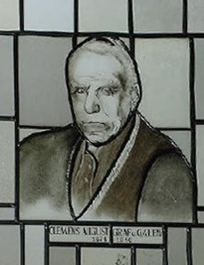 Ein bleiverglastes Fenster im Giebel der Kardinal-von-Galen-Schule zeigt Galen.