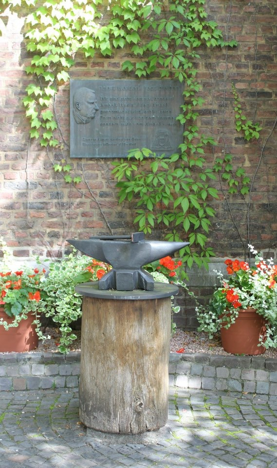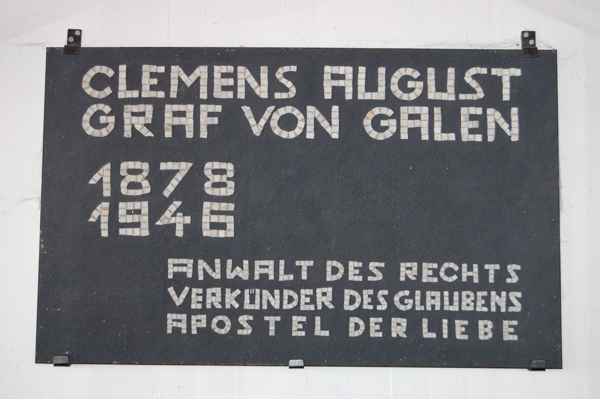 Gedenktafel und Amboss-Denkmal aus dem Jahr 1988 an der Kerzenkapelle unterhalb des Motivfensters mit dem bischöflichen Wappen Clemes August von Galen.
