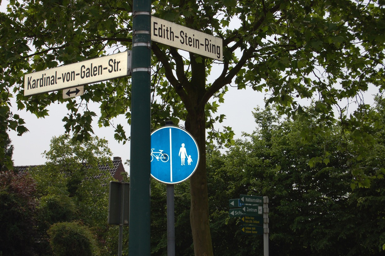Straßenschild an der Ecke Kardinal-von-Galen-Straße / Edith-Stein-Ring in Kevelaer. Edith Stein wirkte 1932/33 als Dozentin in Münster, als Clemens August von Galen Pfarrer von St. Lamberti war.