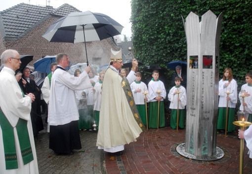 Eine Stele von Künstler Norbert Vorfeld in Winnekendonk erinnert an Glaubenszeugen des 20. Jahrhunderts – so auch an Clemens August von Galen (symbolisch dargestellt mit Hammer und Amboss).