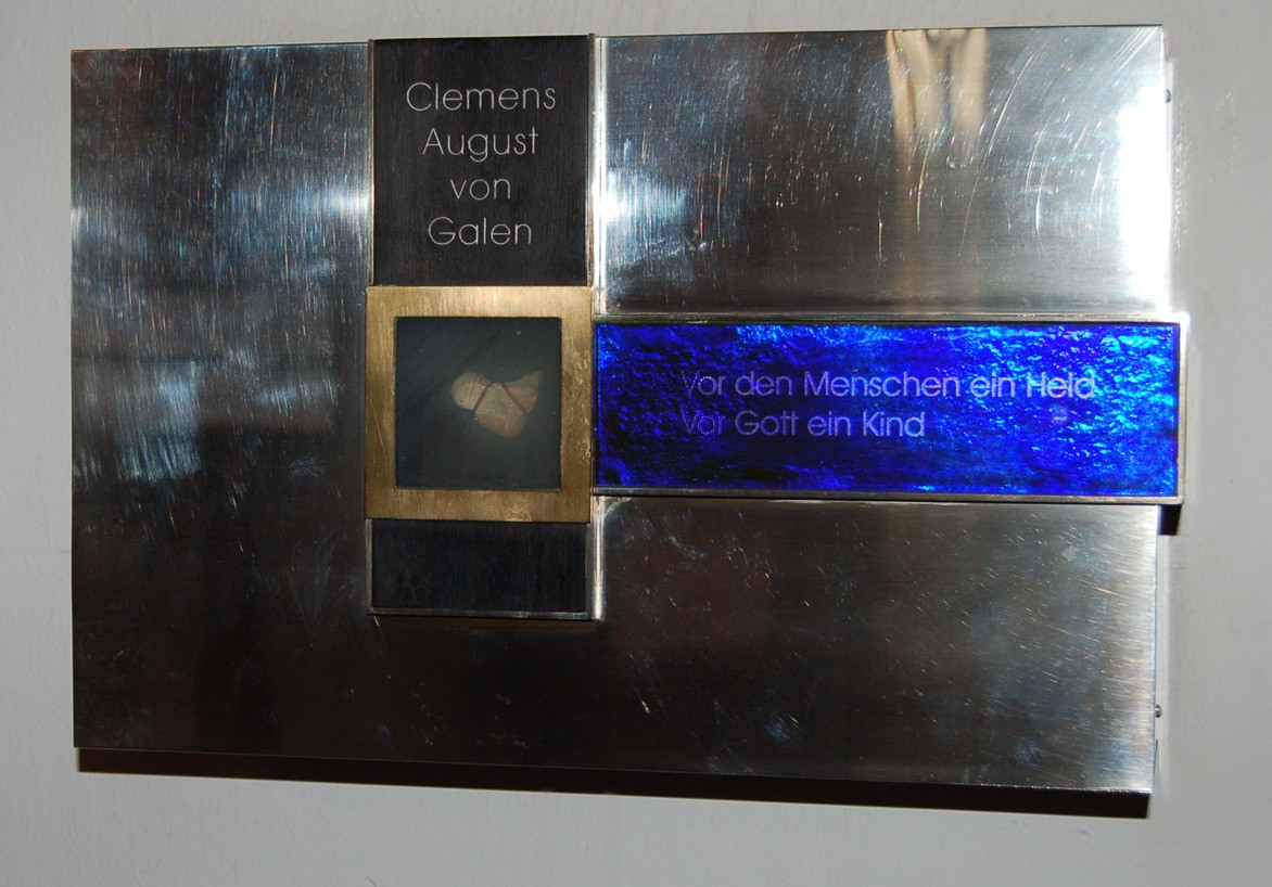 Galenreliquiar von Herbert Cürvers in der Beichtkapelle aus dem Jahr 2007. Auf der Frontseite befindet sich ein Zitat von Kardinal Joseph Frings aus der Traueransprache für Galen: