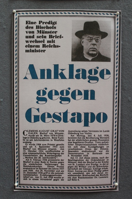 In der St.-Lamberti-Kirche, wo Galen einmal Pfarrer war, kann man bis heute die Kanzel sehen, auf der er im Sommer 1941 zwei seiner berühmten Predigten hielt.