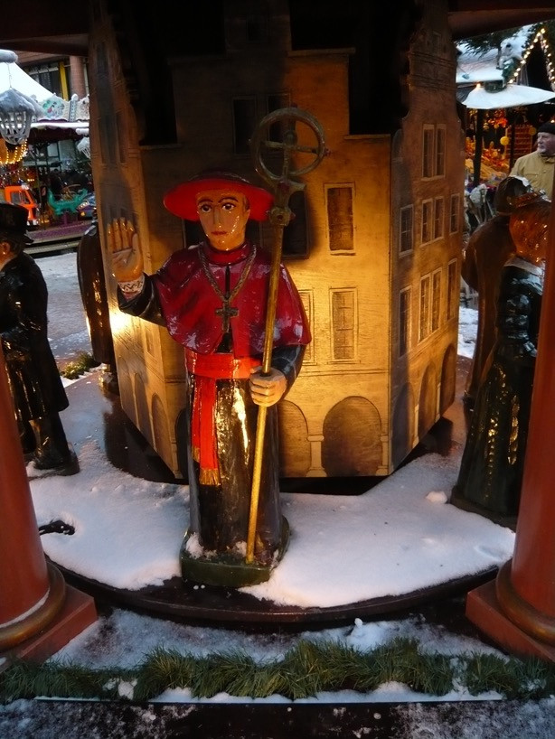 Clemens August von Galen als holzgeschnitzte Figur (ca. 70 cm) an einer überdimensionalen Weihnachtspyramide (Bildhauerwerkstatt Vielstädte Herzebrock) auf dem jährlichen Weihnachtsmarkt im Aegidiihof.