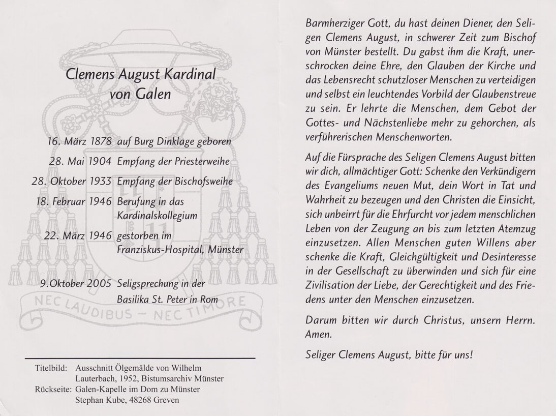 Gebetszettel mit Bitte um die Fürsprache des Seligen Clemens August.