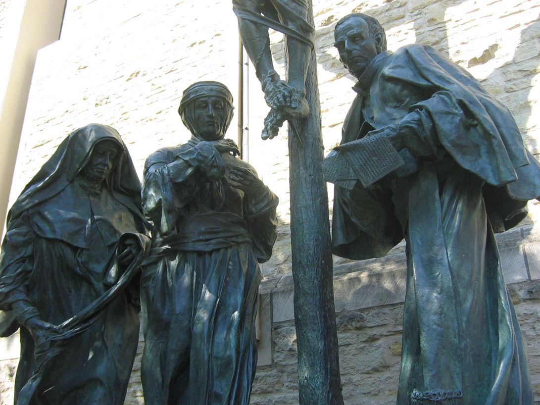 Kreuzigungsgruppe von dem Düsseldorfer Künstler Bert Gerresheim, die im Jahre 2004 eingesegnet wurde. Unter dem Kreuz finden sich anders als bei üblichen Darstellungen, die Maria und Johannes zeigen, Gestalten der älteren und jüngeren Geschichte.