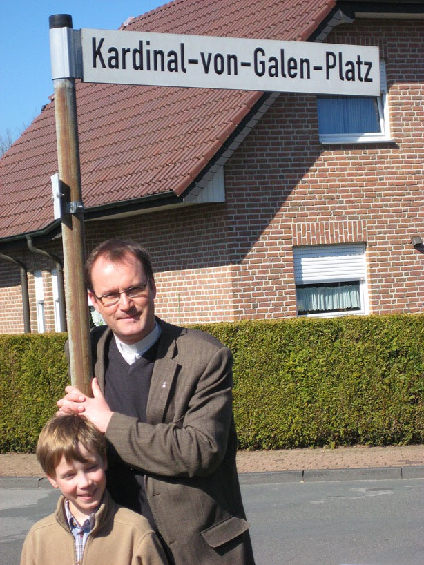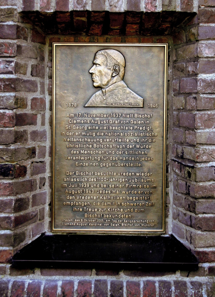 „Am 17. November 1937 hielt Bischof Clemens August Graf von Galen in St. Georg eine vielbeachtete Predigt, in der er mutig die nationalsozialistische Weltanschauung verurteilte und ihr die christliche Botschaft von der Würde des Menschen und der sittlichen Verantwortung für das Handeln jedes Einzelnen gegenüberstellte. Der Bischof besuchte Vreden wieder anlässlich des 1100jährigen Jubiläums im Juli 1939 und bei seiner Firmreise im August 1943. Jedes Mal wurde er von den Vredener Katholiken begeistert empfangen, die damit in schwerer Zeit ihre Treue zur Kirche und zum Bischof bekundeten.“