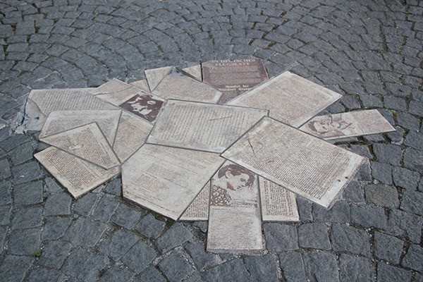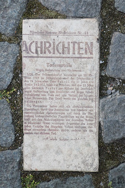 Auf dem Platz wurden in dem Kopfsteinpflaster steinerne Flugblätter, Portaitfotos, der Abschiedsbrief von Willi Graf und Zeitungsberichte eingelassen.